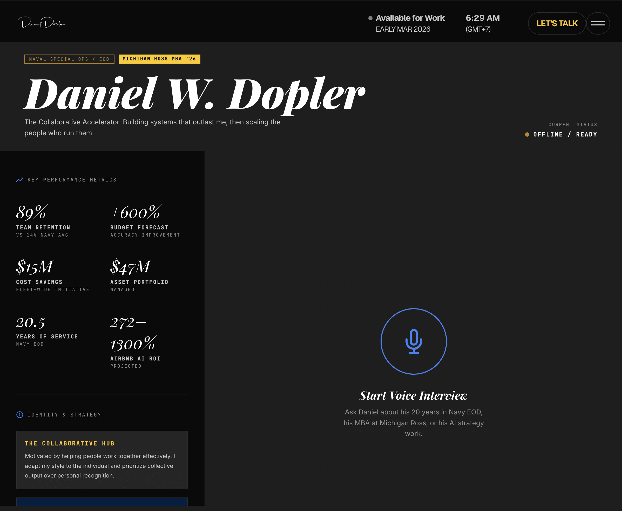 Built a live AI interview agent using Gemini 2.0 Flash and the Web Speech API. Trained it on 20+ behavioral STAR stories, Kolbe Index (6-3-7-3), SDI 2.0, Gallup CliftonStrengths, and a complete career arc from Navy EOD to Michigan Ross MBA. Deployed as a voice-first bento-grid interface: 8 starter prompts, conversational memory, and real-time voice I/O. Embedded directly in the portfolio, so any recruiter can interview Daniel's digital twin, no calendar invite required.